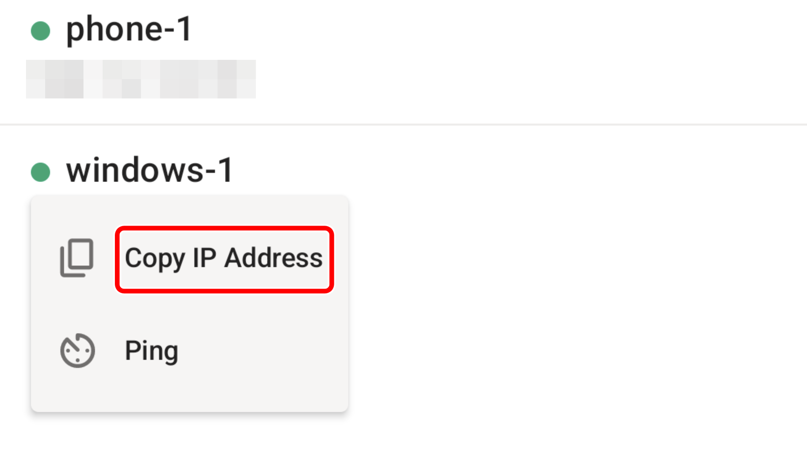 Tailscaleアプリを開き、PCのIPアドレスをコピーします。