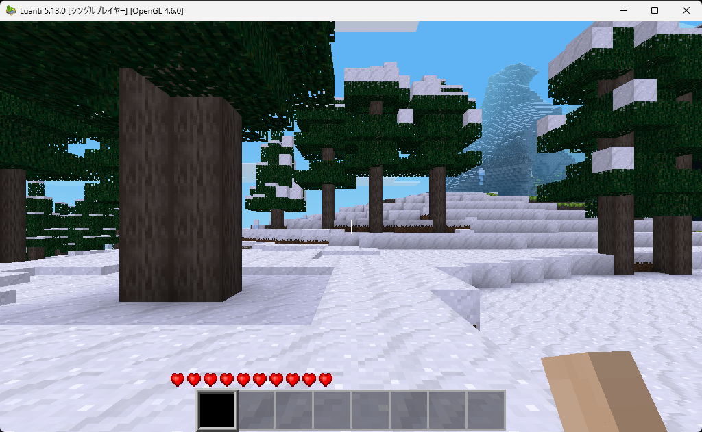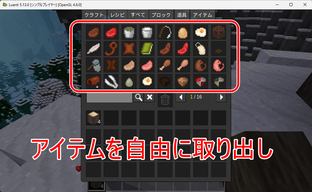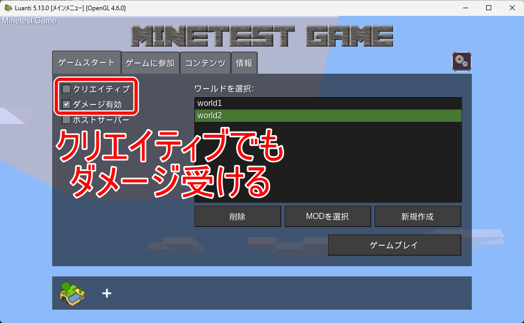 Luantiでは、クリエイティブにするとアイテムを自由に取り出すことができますが、ダメージは受けるので注意が必要です。