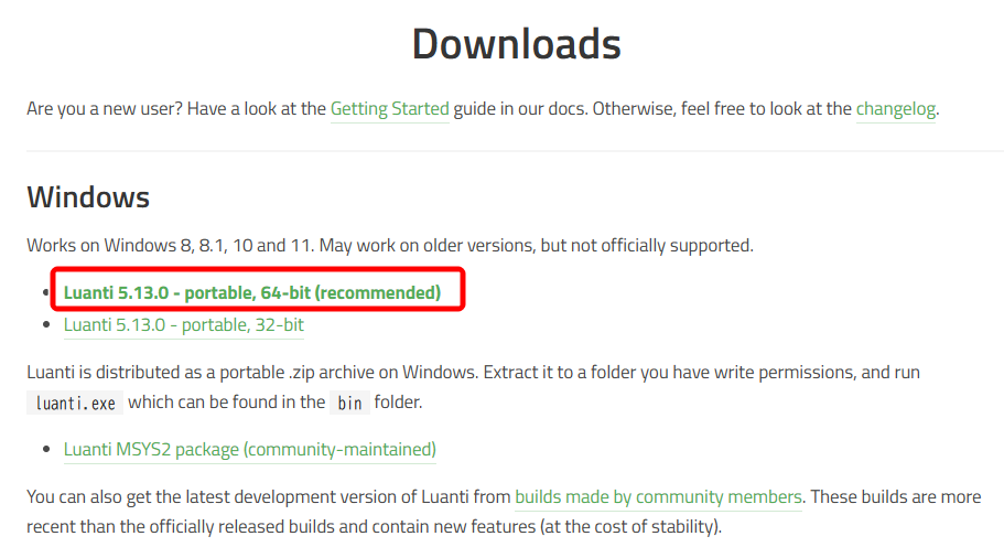 Windows版のLuantiは、インストール作業は必要なく、ファイルをダウンロードするだけです。