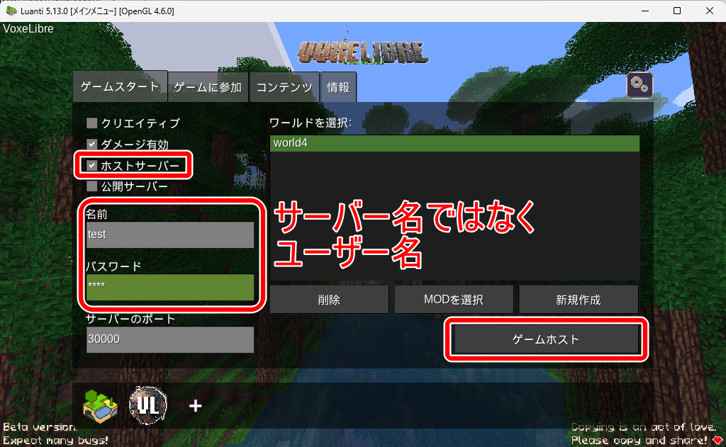「ポート番号」を確認し、「ゲームホスト」をクリックします。(管理者はダメージ無効にしておくことをおすすめします⋯)