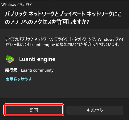 ファイアウォールの警告が表示された場合は、「許可」します。