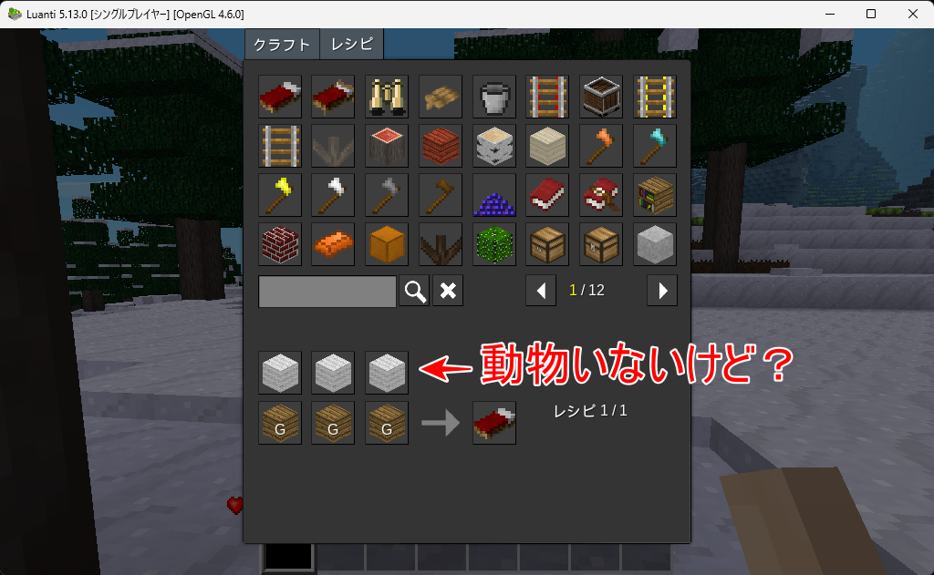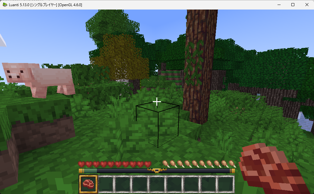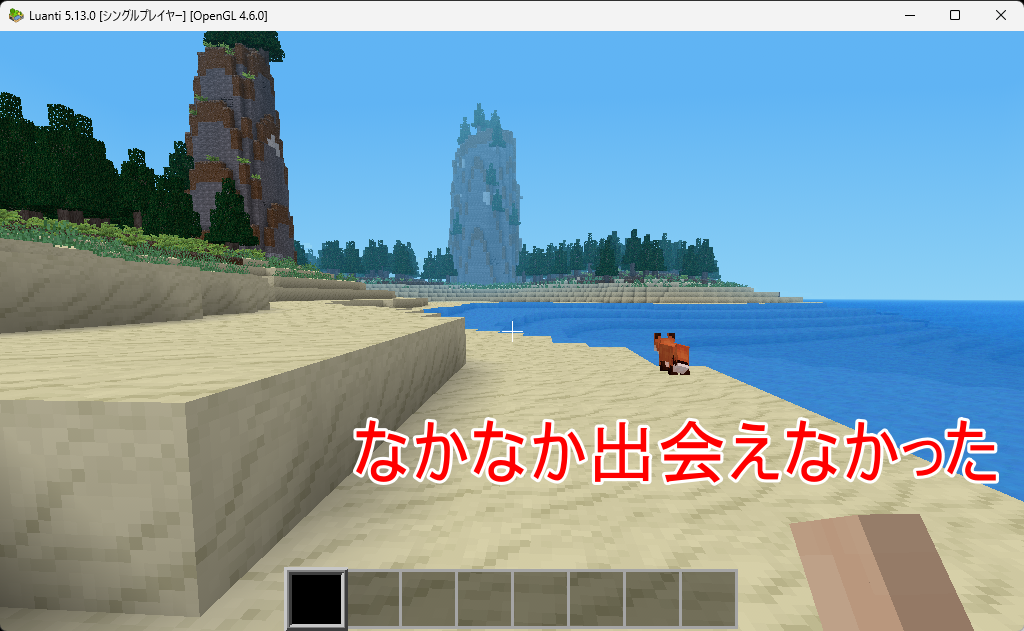 その後ゲームを再開するのですが、スポーン率が低いのか、なかなか動物Mobに出会うことができませんでした。