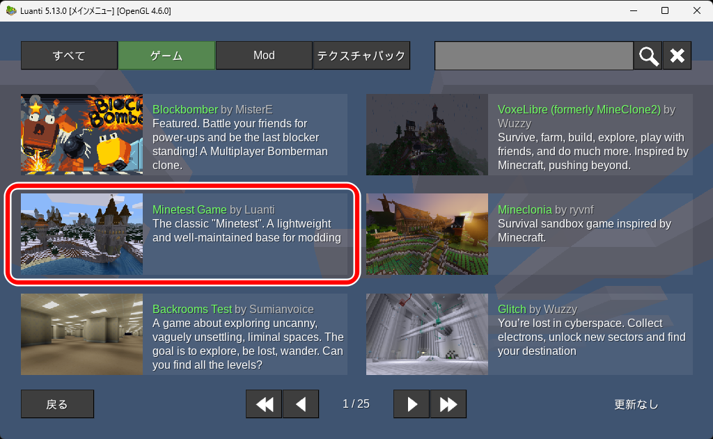 色々なゲームが公開されていますが、まずは元となった「Minetest Game」から始めてみることにします。