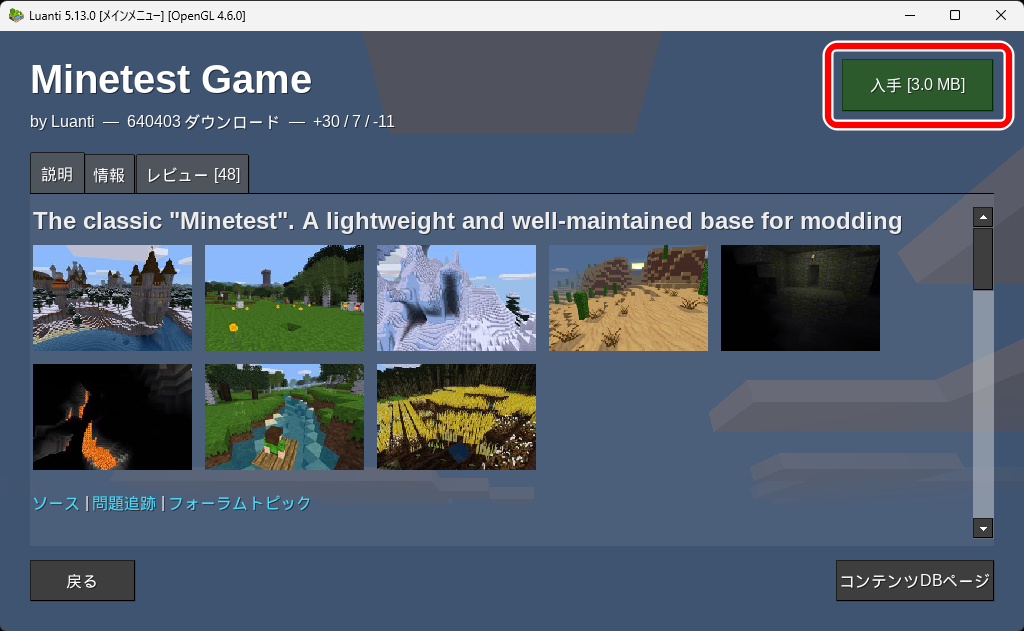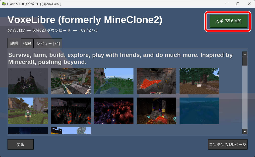 Minetestが3MBなのに対し、こちらは55MBもあります。