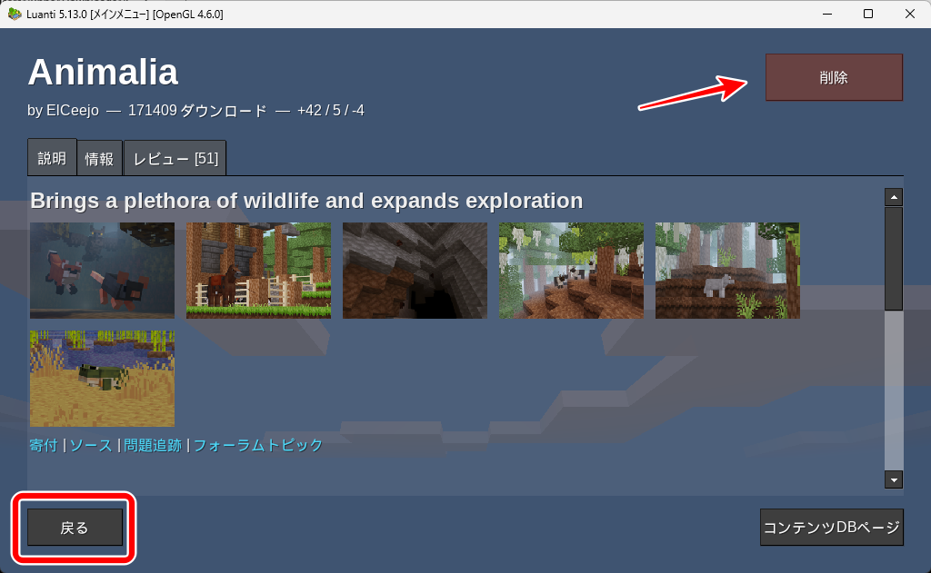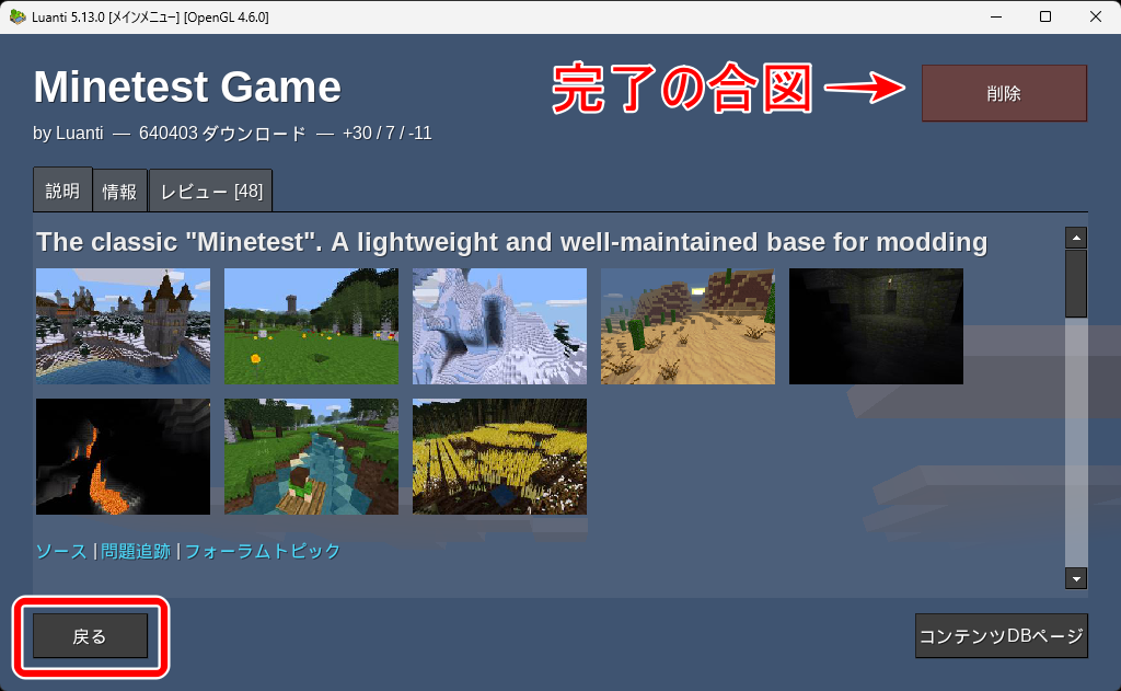 右上が「削除」に変わりインストールが完了したら、「戻る」をクリックします。