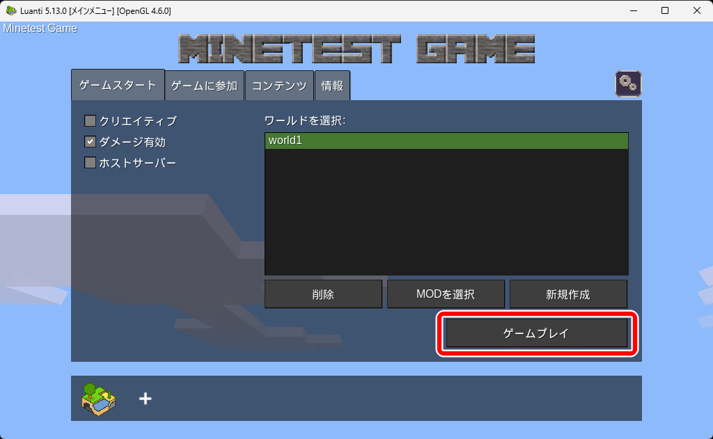 ワールドが作成できたら、「ゲームプレイ」をクリックします。
