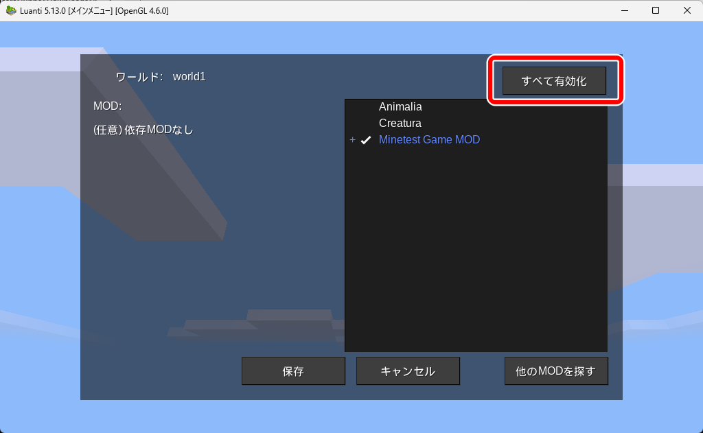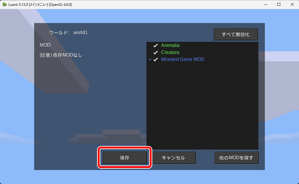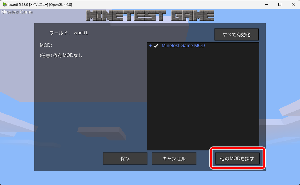 デフォルトのMinetestは虚無空間なので、MODを追加して、自分好みにカスタマイズする必要があります。