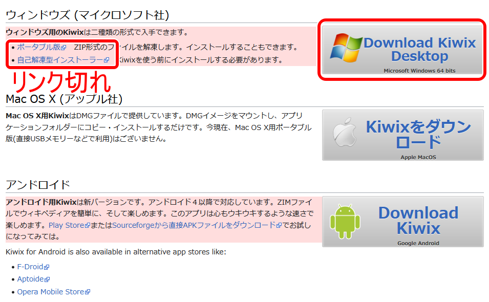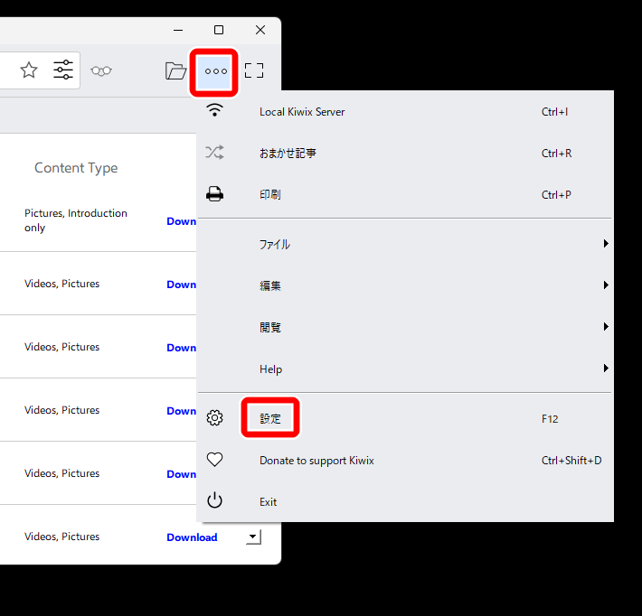 「Kiwixのダウンロード、インストール⋯⋯」をクリックします。