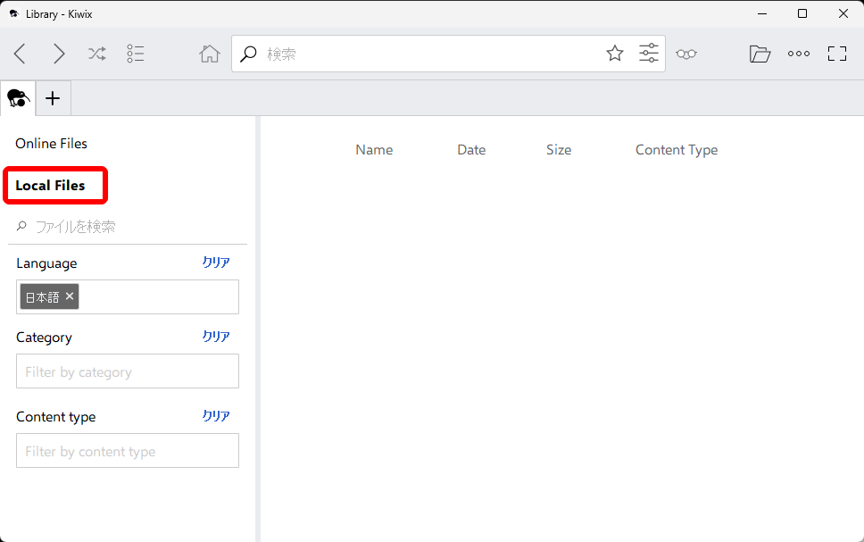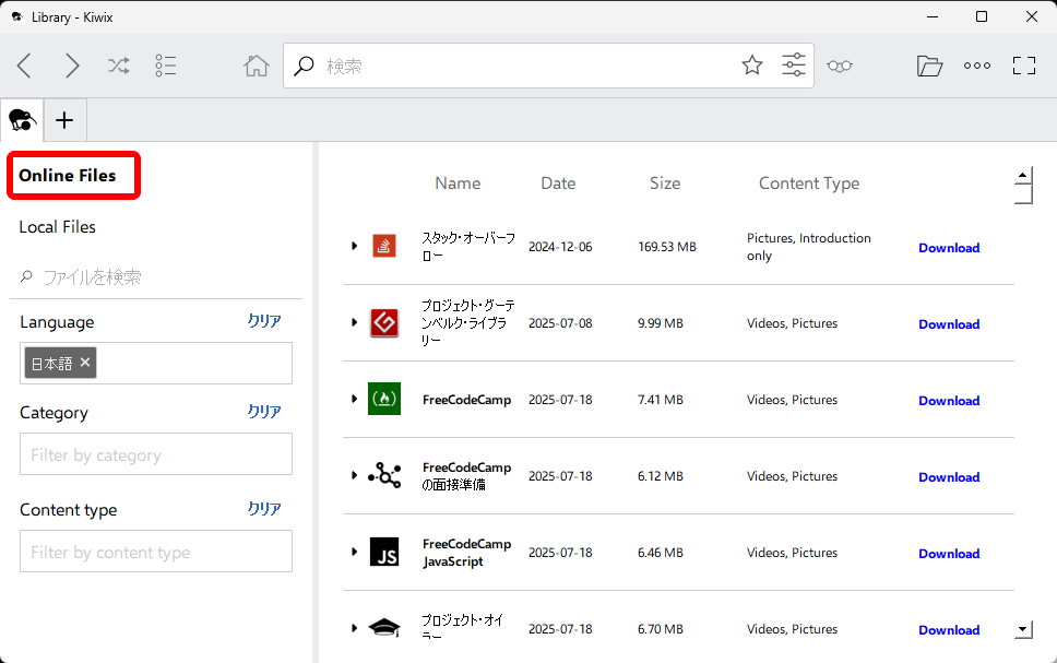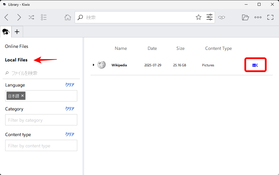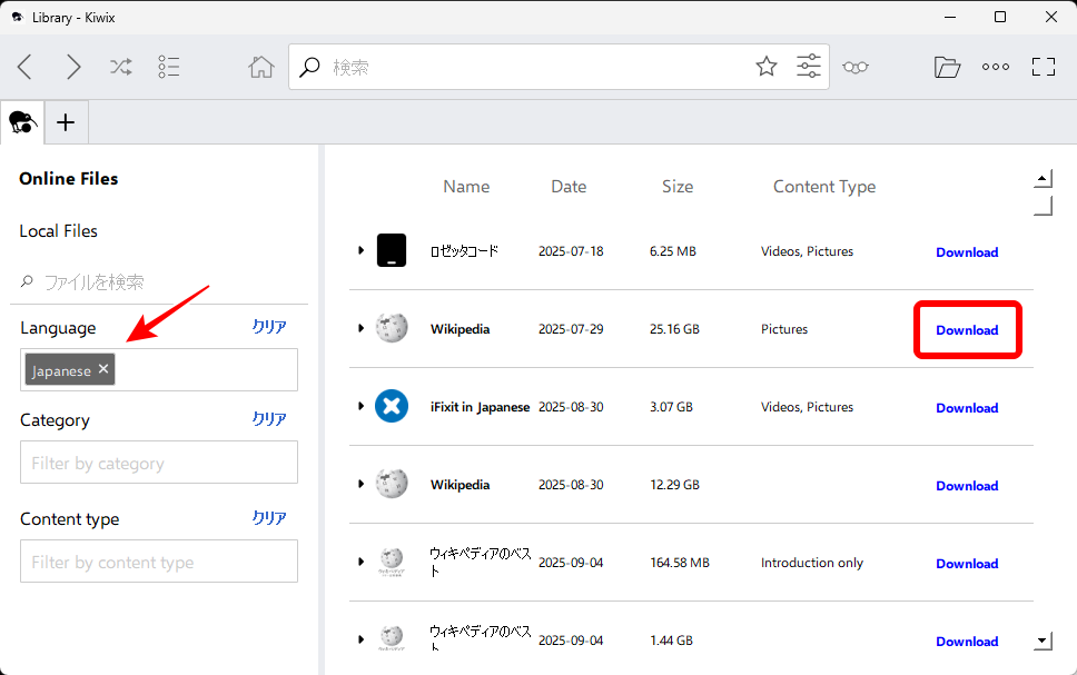 Kiwixでデータを閲覧するには、コンテンツをダウンロードする必要があります。
