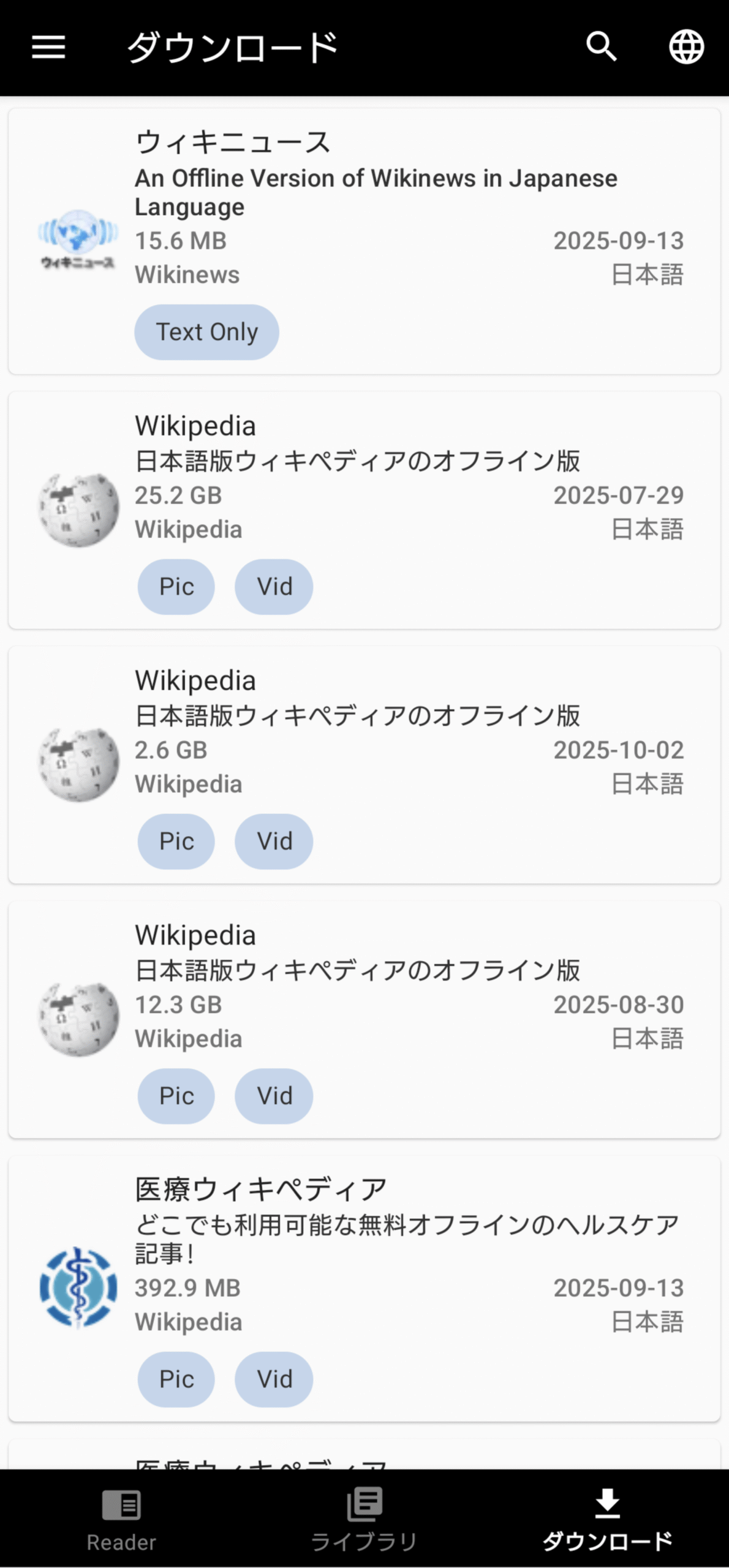 「Kiwix」は、Wikipediaなどの情報サイトを、オフラインで閲覧できるアプリです。