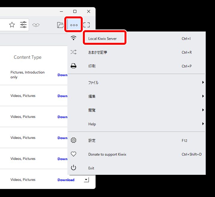 PCのKiwixアプリで「⋯」-「Local Kiwix Server」をクリックします。