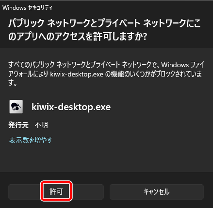 ファイアウォールの警告が表示された場合は、「許可」します。