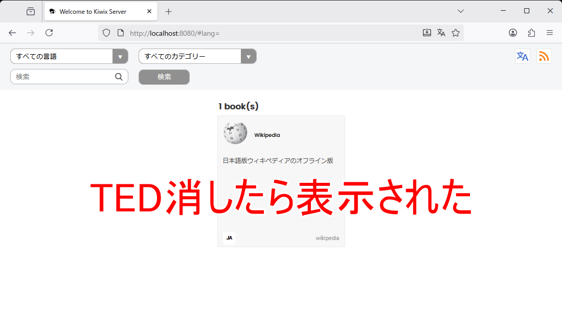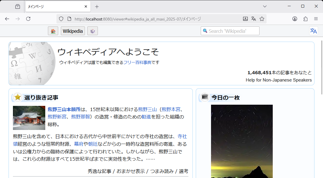 ブラウザで「http://localhost:8080」にアクセスすれば、Kiwixのデータが表示されます。
