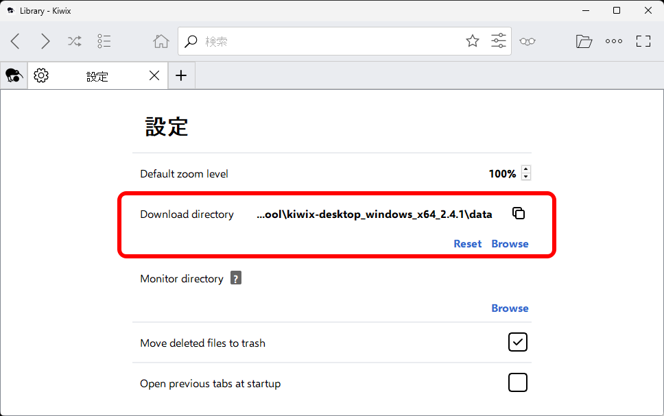 インストール作業は必要なく、ダウンロードしたZIPファイルを展開し、「kiwix-desktop.exe」を実行するだけです。