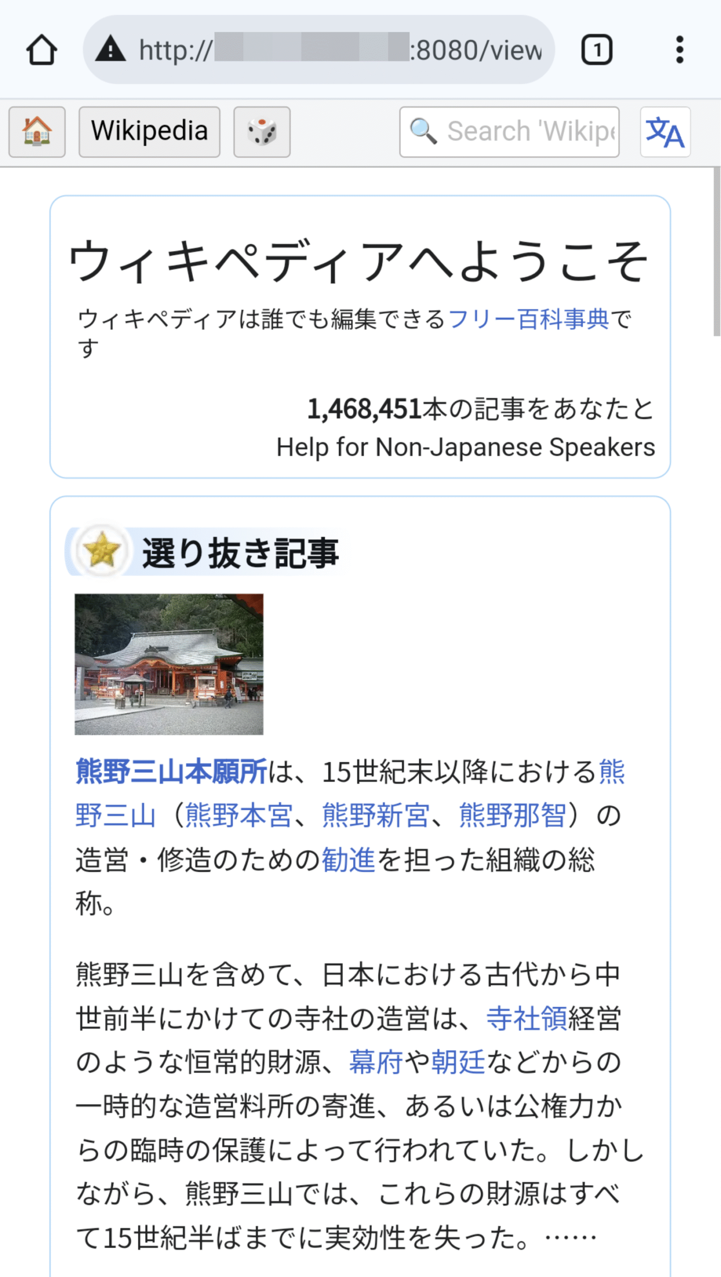 スマホのブラウザから、PC内のWikipediaを表示することができました。