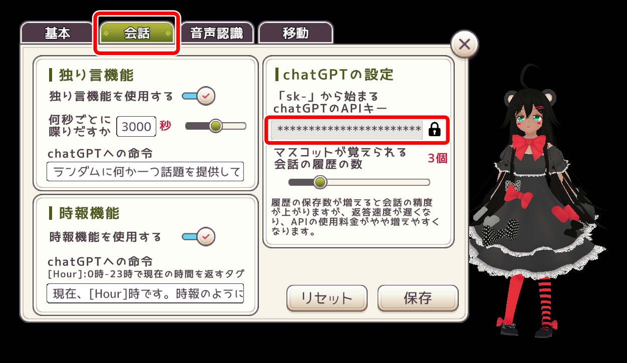 「会話」タブに、ChatGPTのAIキーを登録し、「保存」をクリックします。