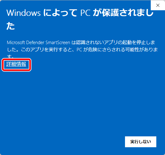 Microsoft Defenderの警告がひょじされた場合は、「詳細情報」をクリックします。