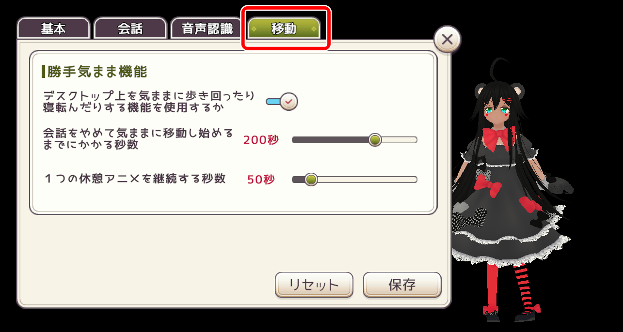 「移動」タブで、「勝手気まま機能」をオンにすると、デスクトップ上を歩いたり、寝転んだりしたりするようになります。