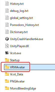 ダウンロードした「.vrm」ファイルを、「VRMAvatar」フォルダに起き、Vcotアプリを再起動します。