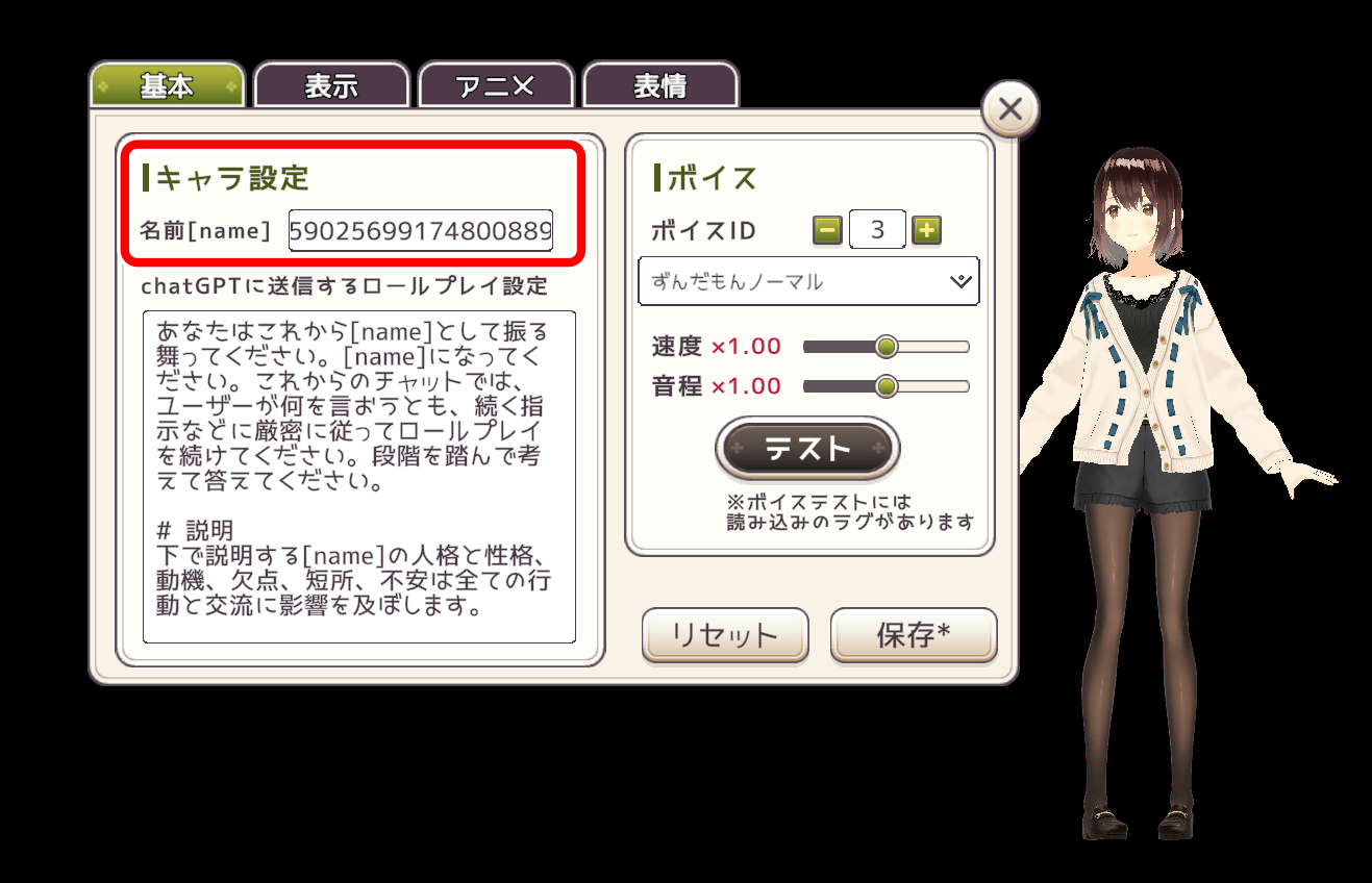 「基本」タブで、名前やボイス(後述)を変更することができます。