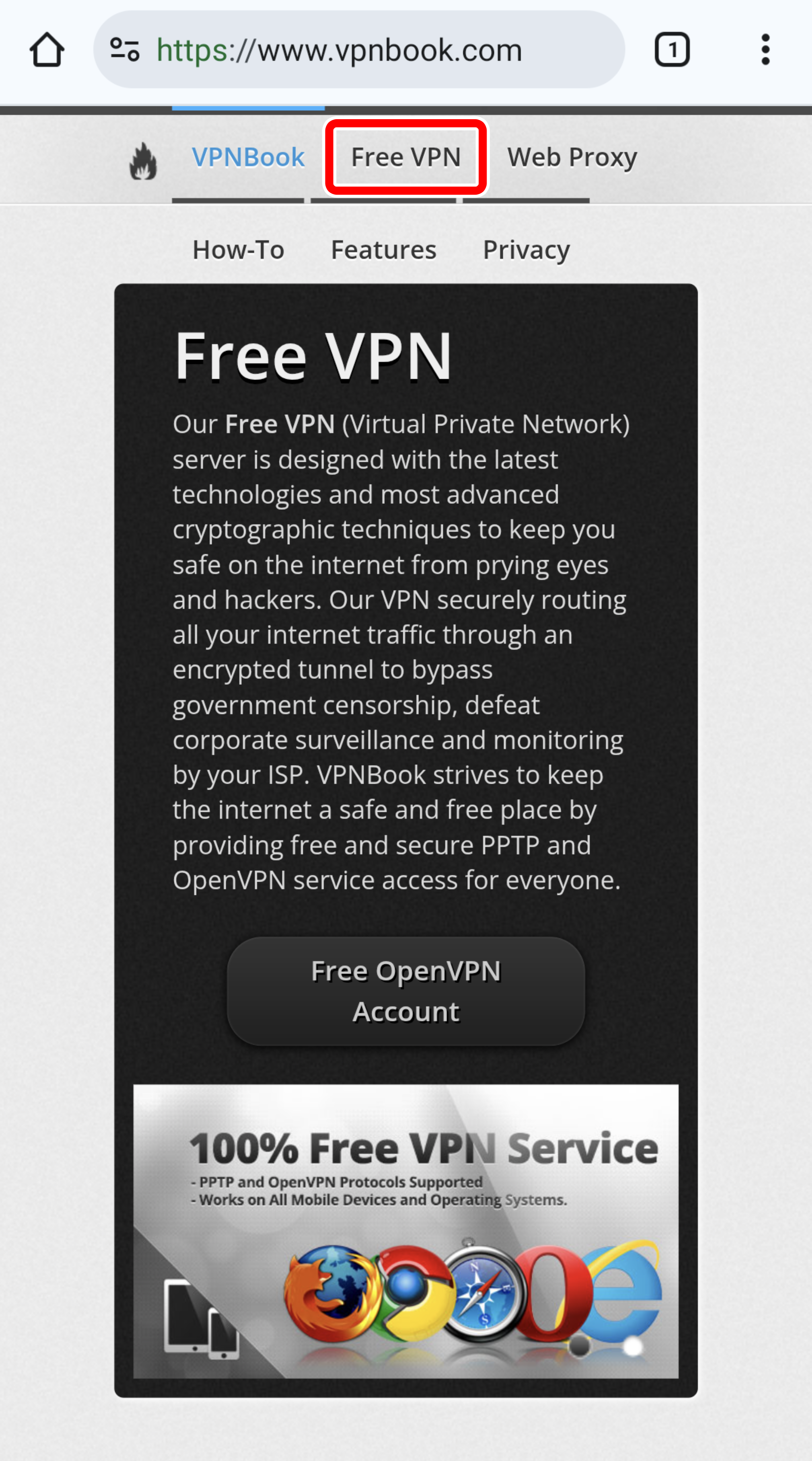 ブラウザで「https://www.vpnbook.com/」を開き、「Free VPN」をタップします。