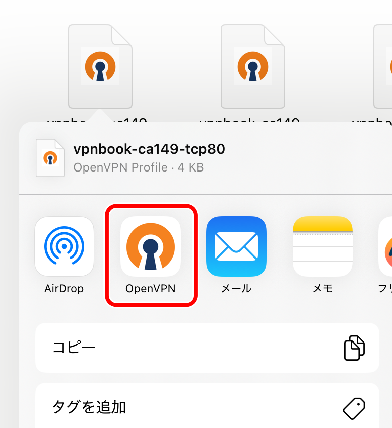 Androidと異なるのは、アプリから設定ファイルを読み込むのではなく、ファイルの共有からOpenVPNアプリを選択するようにします。