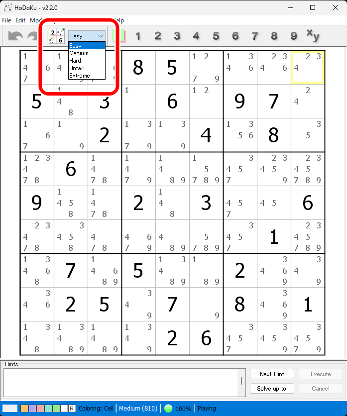 難易度を選択し、その横の「New Sudoku」アイコンをクリックすると、ゲームが開始されます。