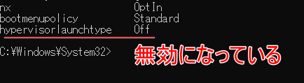 または、管理者権限でコマンドプロンプトを開き、「bcdedit」コマンドを実行し、「hypervisorlaunchtype」が「Auto」か「Off」かでも判断できます。